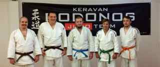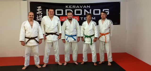 Uusia vyöarvoja Judo 13.6.2014 Graduoinnit kevät / kesä 2014 Bodonoksessa pidettiin tänä keväänä / kesänä neljä graduointitilaisuutta. Uusia vyöarvoja suoritettiin yhteensä 15 kpl. Ensimmäistä kertaa omalla salilla suoritettiin myös kaksi ruskeaa (1 kyu) vyötä, uusien graduointisääntöjen mukaisesti. Graduoinnit: 6.6.2014 Marko Kolehmainen, ruskea vyö (1 kyu) Sampo Mälkiä, ruskea vyö (1 kyu) Tatu Keitaanniemi, sininen vyö (2 kyu) Jukka Lepistö, vihreä vyö (3 kyu) Frey Elmgren, oranssi vyö (4 kyu) Graduoitsijana toimi Janne Nyman (3 dan) Vasemmalta Sampo, Marko, Tatu, Jukka ja Frey 23.5.2014 Tinja Keitaanniemi, sininen vyö (2 kyu) Graduoitsijana toimi Janne Nyman (3 dan) 16.5.2014 Valtteri Anttila, keltainen vyö (5 kyu) Sofia Makris, keltainen vyö (5 kyu) Otto Ramberg, keltainen vyö (5 kyu) Onni Röykkynen, keltainen vyö (5 kyu) Daniel Turkulainen, keltainen vyö (5 kyu) Jenna Kuosmanen, keltainen vyö (5 kyu) Joona Pitkälä, keltainen vyö (5 kyu) Graduoitsijana toimi Manne Nevakko (1 kyu) 5.5.2014 Risto Ramberg, keltainen vyö (5 kyu) Jami Jormakka, keltainen vyö (5 kyu)