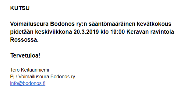 Kutsu Voimailuseura Bodonos ry:n kevätkokoukseen